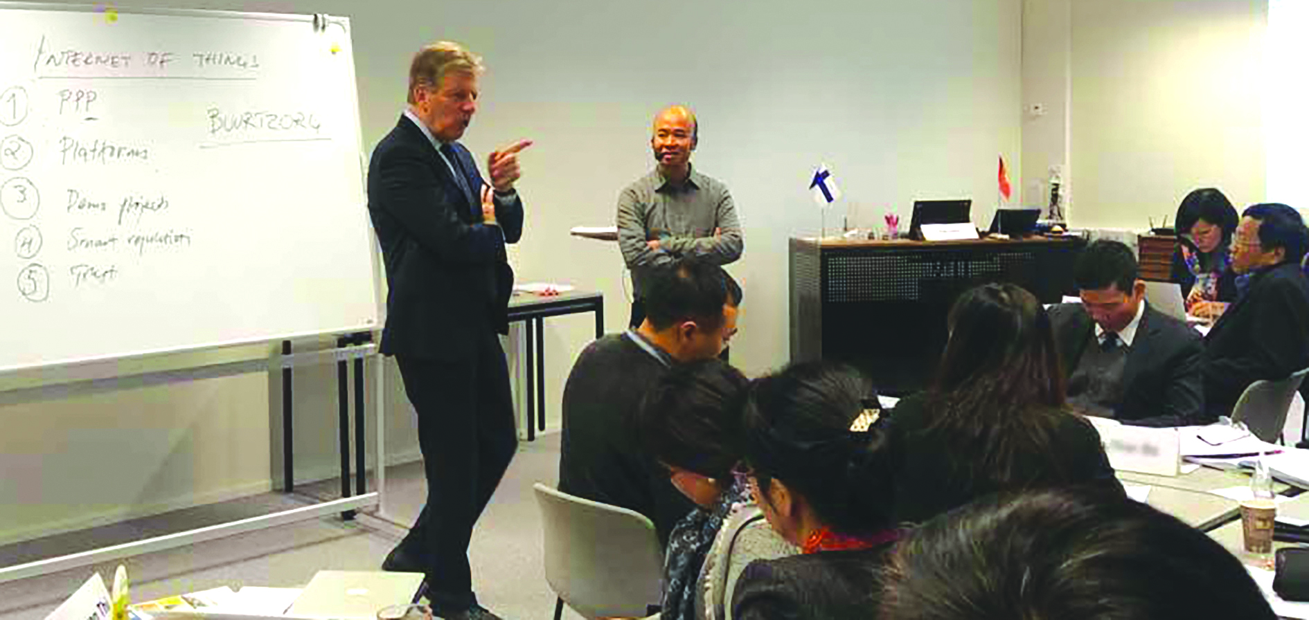 Nhóm cán bộ hoạch định chính sách tham gia khóa học đầu tiên về đổi mới sáng tạo tại Aalto EE vào cuối năm 2016. Người đứng lớp trong ảnh là Esko Aho, cựu Thủ tướng Phần Lan và Phó chủ tịch Hội đồng quản trị tập đoàn Nokia.