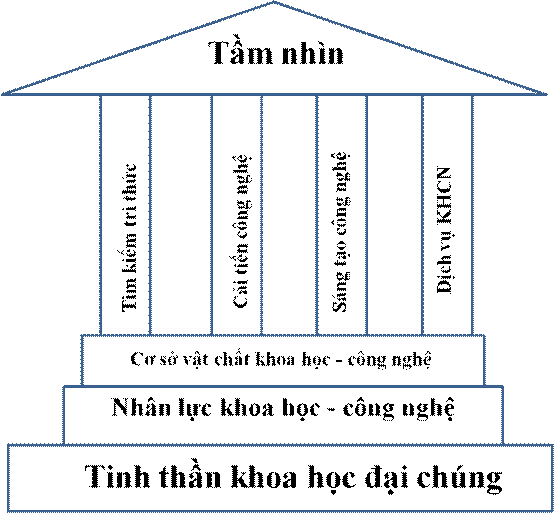 Ở trên cùng, phần nóc ngôi nhà, là tầm nhìn của lãnh đạo khoa học – công nghệ, tức các nhà làm chính sách và các nhà khoa học – công nghệ đầu đàn. Rõ ràng, nếu nóc nhà bị “dột” hoặc thấp kém xập xệ thì ngôi nhà sẽ đổ nát, siêu vẹo.