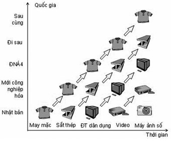 Hình 1 là một bức tranh về dịch chuyển cấu trúc kinh tế ở đông Á[5], trong đó trục hoành chỉ sự thay đổi theo thời gian (tương đối) và trục tung chỉ nhóm các nước ở đông Á có sự phát triển kinh tế chi phối bởi yếu tố tri thức và trình độ sản xuất ở các mức khác nhau. Nhóm các nước mới công nghiệp hóa (NIEs) gồm Hàn Quốc, Hong Kong, Đài Loan và Singapore; nhóm Đông Nam Á 4 gồm Indonesia, Malaysia, Philippines và Thái Lan. Việt Nam nằm trong những nước sau cùng.