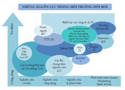 Dựa trên những chính sách phát triển đó, Phần Lan đã tập trung nguồn lực vào hai chương trình chính để thực hiện synergy trong hợp tác liên ngành và nội ngành (cross and intra-sector ) với những mục tiêu cụ thể: (1) Chương trình Trung tâm chuyên môn (Centre of Expertise Programme) nhằm thúc đẩy tính cạnh tranh cho khu vực/tỉnh thông qua tăng cường các hoạt động đổi mới, tái cơ cấu sản xuất nhắm vào các ngành công nghệ và phát triển những ngành nghề chuyên môn dựa vào lợi thế của địa phương; (2) Chương trình phát triển cụm và mạng lưới ( Cluster & Networking Programmes). Đây là một chương trình lớn nhằm hỗ trợ các hoạt động R&D bằng cách thúc đẩy phát triển cụm và synergy giữa doanh nghiệp với khối nghiên cứu & đào tạo, giữa công ty với công ty, giữa các Trung tâm chuyên môn với nhau thành các mạng lưới đổi mới nhằm tăng tốc chuyển giao những know-how mới nhất tới doanh nghiệp cùng những kết quả từ sáng tạo và đổi mới của địa phương. Dựa trên nền tảng một mục tiêu chung, những đơn vị điều phối chính nguồn lực của quốc gia bao gồm TEKES (cơ quan công nghệ quốc gia), Quỹ sáng chế Phần Lan (SITRA) và Công ty đầu tư công nghiệp quốc gia đã phân bổ phần lớn ngân sách nhà nước về khoa học công nghệ cho 2 chương trình chính nói trên. Nguồn ngân sách nhà nước này được hiệp lực với các nguồn tài chính và đầu tư tư nhân và đầu tư nước ngoài đã làm tăng hiệu quả lớn hơn nhiều (xem sơ đồ những nguồn lực trong môi trường đổi mới).