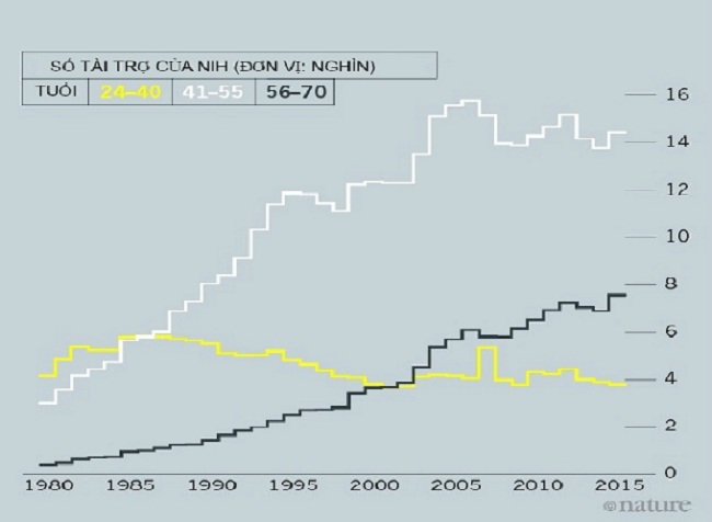 Có những thống kê cho thấy, những nhà khoa học nhiều tuổi hơn giành được phần lớn các khoản tài trợ nghiên cứu – đây là một thay đổi rõ rệt so với 30 năm trước. Ví dụ, theo khảo sát của NIH, trung bình một nhà khoa học ở độ tuổi 24-40 nhận được tài trợ 4.000 USD, trong khi nhà khoa học ở độ tuổi 41-55 nhận được gần 8.000 USD và nhà khoa học ở độ tuổi 56-70 nhận được hơn 14.000 USD. Mặc dù NIH đã tìm cách san phẳng tỷ lệ xin tài trợ thành công giữa các độ tuổi bằng cách hỗ trợ thêm những người xin tài trợ lần đầu, nhưng thống kê từ năm 2000 cho thấy, độ tuổi trung bình mà các nhà khoa học có học vị tiến sĩ lần đầu nhận được khoản tài trợ quan trọng là vào khoảng năm 42 tuổi (hình 1).