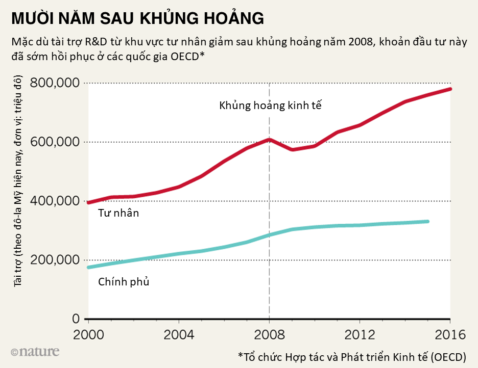 Dữ liệu từ Tổ chức Hợp tác và Phát triển Kinh tế (OECD) cho thấy một sự thật ngạc nhiên: dù có bị ảnh hưởng ban đầu ngay sau khủng hoảng thì về tổng thể, việc tài trợ cho nghiên cứu và phát triển (R&D) vẫn duy tri được sự tăng trưởng ổn định.