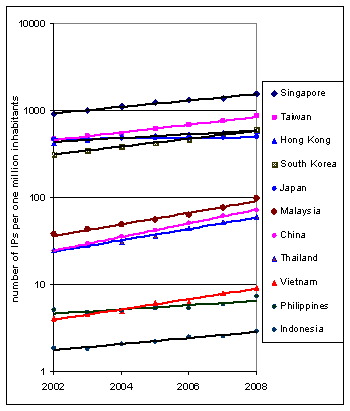 Hình 1 cho thấy NSNCQG của các nước tăng trưởng với tốc độ khá ổn định. Việt Nam, Thái Lan và Malaysia có tốc độ tăng trưởng nhanh, khoảng 15-16% hàng năm, song số CBQT trên một triệu dân của Việt Nam vẫn thấp hơn Thái Lan 6,5 lần và Malaysia 9.5 lần. Tuy nhiên, Việt Nam lại cao hơn Indonesia 3 lần; và từ năm 2004 đã vượt qua Philippines, nước có tốc độ tăng trưởng hằng năm chỉ ở mức 5,7%. Trung Quốc tăng trưởng nhanh nhất, khoảng 20% /năm; họ đã vượt qua Thái Lan và chuẩn bị đuổi kịp Malaysia. Trong khi đó, các nền kinh tế tiên tiến có NSNCQG cao nhất trong khu vực lại tăng trưởng chậm hơn, như Hàn Quốc, Đài Loan, và Singapore; khoảng 9-11% hằng năm; Hồng Kông: 5%/năm và Nhật Bản: 1%/năm