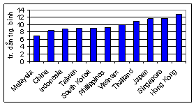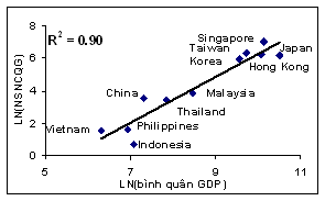 Singapore dẫn đầu khu vực về NSNCQG, cao hơn Thái Lan, Việt Nam và Indonesia lần lượt là 30, 170 và 530 lần, tiếp theo là Đài Loan, Hàn Quốc, Hồng Kông và Nhật Bản (Hình 1) Indonesia, Philippines và Việt Nam tạo thành nhóm các nước có NSNCQG thấp nhất trong vùng, cả ba còn phải trải qua một chặng đường dài phía trước để đạt tới trình độ hiện nay của Thái Lan, Trung Quốc và Malaysia. Nhưng đến lượt các nước này vẫn còn cách xa nhóm các nước phát triển nhất bao gồm Singaeare, Hồng Kông, Hàn Quốc, Nhật Bản và Đài Loan.