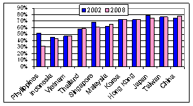 Hình 5. Tỉ lệ bài báo có tác giả đầu mối trong nước của các nước Đông Á năm 2008.