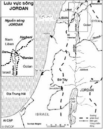 Tranh chấp tài nguyên nước trong vùng lưu vực sông Jordan (hình 2) lại càng phức tạp do có tình trạng chiến tranh giữa Israel và các quốc gia khác ven sông như Liban, Syria, Jordan. Sông Jordan tuy không lớn lắm, lưu lượng chỉ bằng 2% lưu lượng sông Nil hay 7% sông Euphrates nhưng nó rất quan trọng đối với nền kinh tế các nước ven sông.