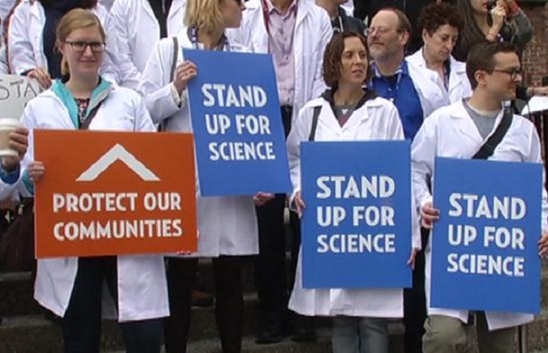 Một số nhà khoa học đã xuống đường để phản đối Trump. Tại cuộc họp của Hội Địa vật lý Mỹ vào ngày 13 tháng 12 tại San Francisco, các nhà nghiên cứu đã cùng tham gia sự kiện biểu tình “hãy đứng lên vì khoa học” ngay gần trung tâm tổ chức hội nghị. Khoảng 30 nhà khoa học mặc đồng phục phòng thí nghiệm, mang theo những biểu ngữ như “Băng tuyết không nghị sự – nó chỉ tan chảy”. Hơn một trăm người đứng xem cũng mang theo những biểu ngữ như “Chúng tôi yêu khoa học”, và cùng hô “Hãy đứng lên vì khoa học”.