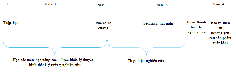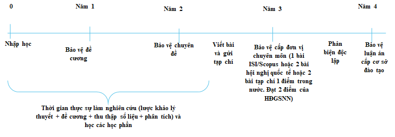 Thời gian đào tạo tiến sĩ tiêu chuẩn là từ 3 – 4 năm, theo TT18. Tôi lấy mốc bốn năm cho rộng rãi và sẽ phân tích ngược từ phải qua trái để thấy muốn có kết quả, phải thực hiện những bước cần thiết gì. Cuối năm thứ tư, NCS bảo vệ luận án cấp cơ sở đào tạo, nếu thành công, xem như đã hoàn tất quá trình đào tạo và chờ nhận bằng tiến sĩ. Để đi đến hội đồng này, luận án phải được hai phản biện độc lập thông qua về chuyên môn. Quá trình phản biện và trả lời thường kéo dài 4 – 5 tháng. Thời gian làm hồ sơ phản biện, phản hồi, hồ sơ bảo vệ luận án cấp cơ sở đào tạo và lập hội đồng có thể kéo dài một năm. Như vậy NCS phải cố gắng để có được hội đồng bảo vệ cấp đơn vị chuyên môn vào khoảng cuối năm thứ ba. Tại thời điểm này, theo cả TT08 và TT18, luận án cần có các sản phẩm hoàn chỉnh, được công nhận xuất bản trên tạp chí ISI hoặc Scopus, hoặc phải có hai sản phẩm hoàn chỉnh được bình duyệt, hoặc nộp cho hai hội thảo quốc tế (TT08) hoặc hai tạp chí trong nước 1.0 điểm (TT18). Tôi nhấn mạnh lại, cuối năm thứ ba, NCS phải có hai sản phẩm được bình duyệt thành công. Có thể đích đến chất lượng không cao, nhưng phải là sản phẩm hoàn chỉnh.