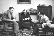 ![]() Robert Oppenheimer, Paul Dirac và Abraham Pais tranh luận trong giờ uống trà tại phòng sinh hoạt tập thể. Einstein trên đường từ Viện nghiên cứu cao cấp về nhà |