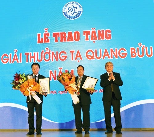 Bộ trưởng Bộ KH&CN Nguyễn Quân trao giải thưởng Tạ Quang Bửu lần thứ nhất cho hai nhà khoa học: GS. TSKH Nguyễn Hữu Việt Hưng (trái) và PGS. TS Nguyễn Bá Ân.