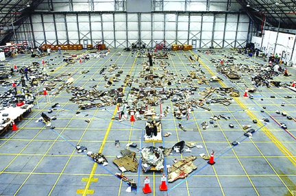 Ngày 1/2/2003, thảm họa lại đến với chương trình không gian, khi Trung tâm Điều khiển Nhiệm vụ của NASA bị mất liên lạc với tàu con thoi Columbia khi nó trong sứ mệnh tiếp đất. Con tàu bị nổ trên không trung bang Texas, làm chết bảy nhà du hành. Các mảnh vụn của Columbia được tìm thấy trên diện rộng tại hai bang Texas và Louisiana. Trong hình, NASA cho xếp các mảnh vụn thu lại được theo ô kẻ, nhằm tìm hiểu nguyên nhân gây ra vụ nổ.
