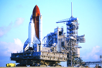 Thảm họa Challenger làm trì hoãn chương trình tàu con thoi của Mỹ mất 32 tháng. Sau đó tới tháng 9 năm 1988, chương trình tiếp tục với việc phóng tàu Discovery. Trong hình, con tàu được đặt trên một bệ phóng di động trong vài tuần trước khi được phóng lên.