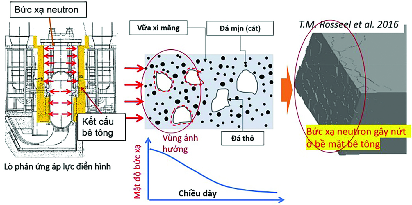 Tuy nhiên, với thời gian vận hành dài như vậy, tính chất của bê tông có thể thay đổi do bị chiếu một liều neutron cao gần với 1020 (n/cm2). Với mức liều chiếu này, có thể xảy ra sự chuyển pha từ tinh thể (crystalline) sang vô định hình (amorphization) ở cốt liệu đá trong bê tông bởi vì đá được hình thành từ các tinh thể tự nhiên như thạch anh (SiO2), albite (NaAlSi3O8)… Sự vô định hình gây ra giãn nở thể tích, lớn nhất khoảng 18% ở thạch anh, do đó có thể gây nứt trong bê tông (như hình 1). Do đó, cơ chế suy thoái do bức xạ ở bê tông sẽ liên quan trực tiếp đến các yếu tố ảnh hưởng và kiểm soát sự vô định hình ở thạch anh như liều chiếu xạ (irradiation dose), mật độ (flux) và nhiệt độ.