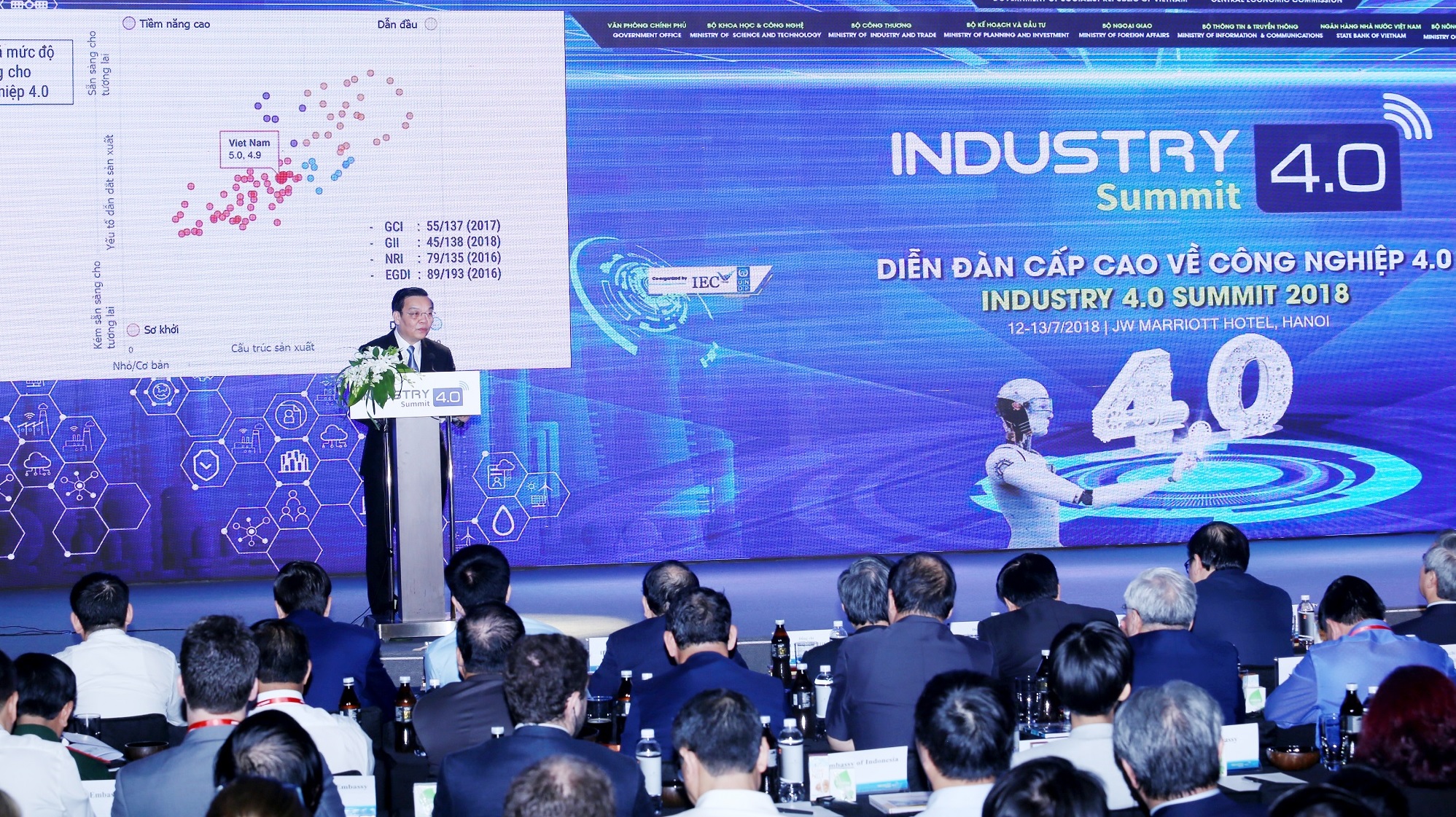 Sáng 13/7/2018, Diễn đàn Cấp cao và Triển lãm quốc tế về Công nghiệp 4.0 do Văn phòng Chính phủ, Bộ KH&CN, Bộ Ngoại giao, Bộ TT&TT, Ngân hàng Nhà nước, Bộ NNPT&NT, UBND TP Hà Nội và Tập đoàn IEC phối hợp tổ chức, đã khai mạc. Thủ tướng Nguyễn Xuân Phúc đã tới dự buổi lễ.