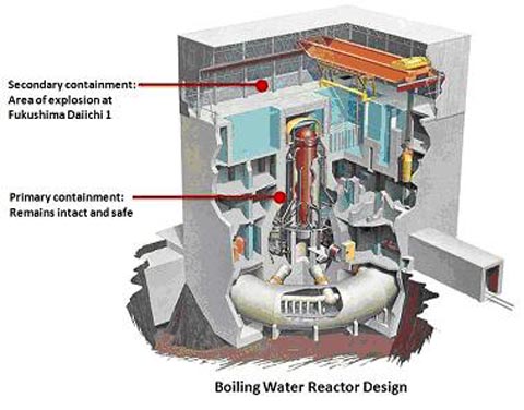 Nhà máy điện Fukushima Daiichi vận hành bằng sáu lò phản ứng đun nước sôi, tất cả đều được hoàn thiện trong thập kỷ 1970. Các lò phản ứng có chi tiết kỹ thuật khác nhau, nhưng nguyên tắc thì giống nhau: lõi lò bao gồm một bình hình con nhộng chứa các dàn nhiên liệu. Mỗi dàn nhiên liệu chứa hàng trăm thanh nhiên liệu. Mỗi thanh nhiên liệu là một ống dài, hẹp bằng hợp kim zirconium, bên trong chứa đầy các hạt uranium đã được làm giàu tới 3-5% của đồng vị U-235. (Riêng với lò phản ứng số 3 thì nhiên liệu hoạt động là Plutonium-239).