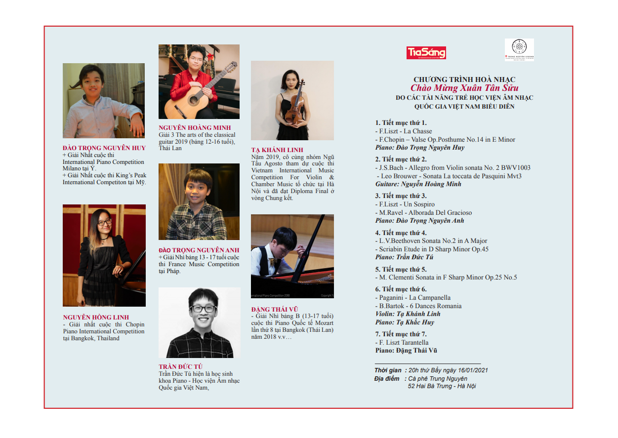 Đây sẽ là một buổi hòa nhạc thính phòng do các tài năng trẻ của Học viện Âm nhạc Việt Nam biểu diễn – những gương mặt dù còn rất ít về “tuổi đời, tuổi nghề” nhưng đã bắt đầu bộc lộ một số thiên hướng âm nhạc và hứa hẹn trong tương lai sẽ là những nghệ sĩ đáng chú ý của sân khấu âm nhạc cổ điển nước nhà, nếu vẫn duy trì được sự đam mê và khổ luyện trên con đường nghệ thuật. Trong buổi hòa nhạc này, các nghệ sĩ trẻ sẽ giới thiệu một bức tranh đầy sắc màu tươi tắn và ấm áp, mở rộng từ thời kỳ Baroque trải qua thời kỳ Cổ điển, Lãng mạn đến đầu thế kỷ 20 với những tiểu phẩm xinh xắn và duyên dáng của các nhà soạn nhạc như J S Bach, L v Beethoven, N Paganini, F Chopin, F Liszt, B Bartók…