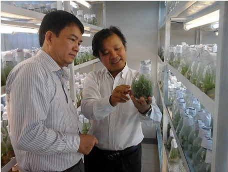 GS. TS Lê Huy Hàm (phải) giới thiệu cơ sở nghiên cứu tạo giống cây trồng của Viện Di truyền nông nghiệp với TS. Trần Chí Thành.