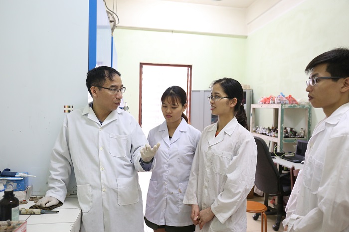 TS. Lê Trọng Lư (trái) và các học trò trong phòng thí nghiệm Viện Kỹ thuật Nhiệt đới, Viện Hàn lâm KH&CN Việt Nam. Ảnh: Thanh Nhàn