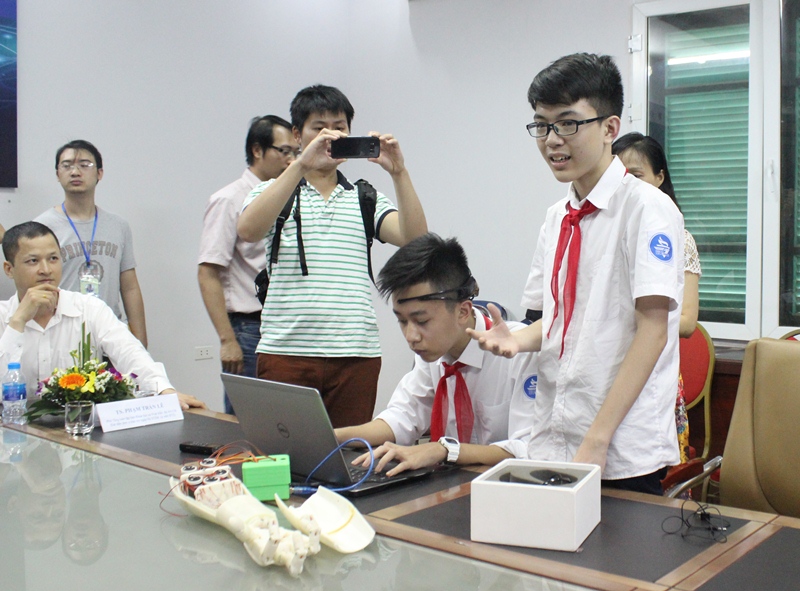 Phan Trường Anh Khôi (ngồi) và Nguyễn Công Huy (đứng) trình diễn điều khiển cánh tay robot bằng ý nghĩ. Ảnh: Công Nhất.