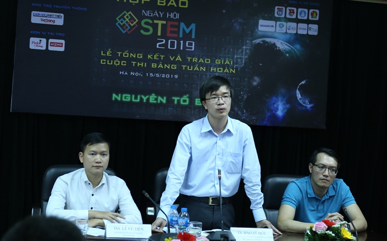 TS. Đào Sỹ Đức (giữa), Bí thư Đoàn Trường Đại học Khoa học tự nhiên, ĐH Quốc gia Hà Nội, Phó trưởng ban Thường trực Ngày hội STEM 2019, chủ trì họp báo. Ảnh: Công Nhất