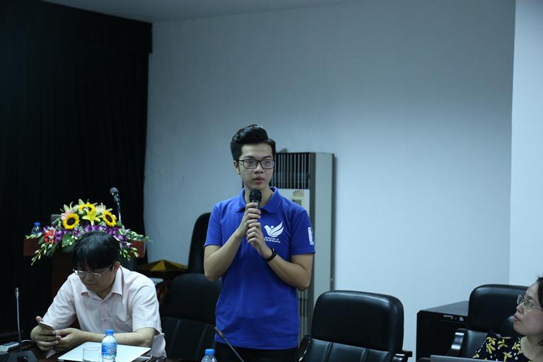 Có mặt tại buổi họp báo, em Hà Công Minh, Sinh viên năm thứ nhất Khoa Cơ khí, ĐH Bách khoa Hà Nội, “một sản phẩm của giáo dục STEM ở trường làng [Thái Thụy, Thái Bình]”, chia sẻ về việc giáo dục STEM đã truyền cảm hứng để em hoàn thiện sản phẩm và giành giải 3 tại cuộc thi Khoa học Kỹ thuật toàn quốc ra sao. Ảnh: Công Nhất