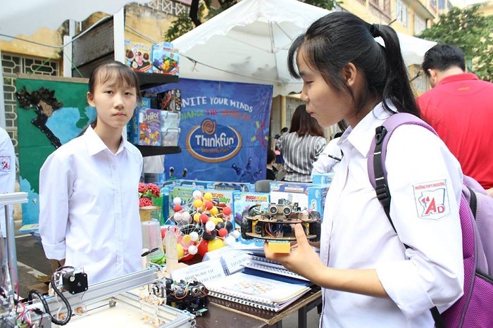 Tiêu Hồng Nhung (phải), HS lớp 11, trường THPT An Dương, huyện An Dương, Hải Phòng đang giải thích về quá trình thiết kế, lập trình hai robot dò đường và tránh vật cản trong ngày hội STEM 2018. Ảnh: Bảo Như.