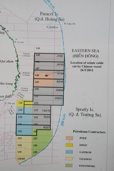 Bản đồ 09 lô dầu khí mà Trung Quốc gọi thầu, nằm gần như trọn vẹn trong vùng đặc quyền kinh tế 200 hải lý của Việt Nam, trong đó lô 148 là nơi đã xảy ra sự kiện Bình Minh 02 ngày 26.5.2011.