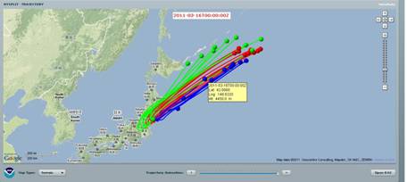 ![]() Quỹ đạo gió dự báo từ Fukushima (từ 01h ngày 16/3/2011 đến 13h ngày 19/3/2011, giờ Việt Nam), HYSPLIT – Hybrid Single Particle Lagrangian Integrated Trajectory Model. |