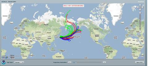 Dưới đây là quỹ đạo gió từ Fukushima và dòng hải lưu dự báo trên Thái Bình Dương lấy từ NOAA (National Oceanic and Atmospheric Administration).