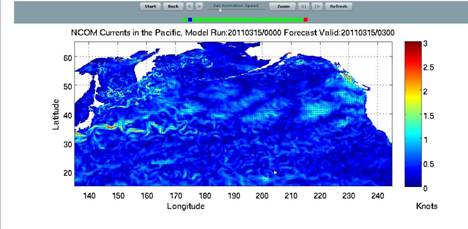![]() Dòng hải lưu dự báo trên vùng Thái Bình Dương, 03h ngày 15/3/2011, giờ GMT (tức 10h ngày 15/3/2011, giờ Việt Nam), U.S. Navy Operational Global Ocean Model. |