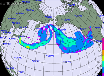 Dưới đây là hình ảnh đám mây phóng xạ từ kết quả tính toán từ 21-24 giờ UCT ngày 12,13 và dự đoán đến ngày 18/3/2011: