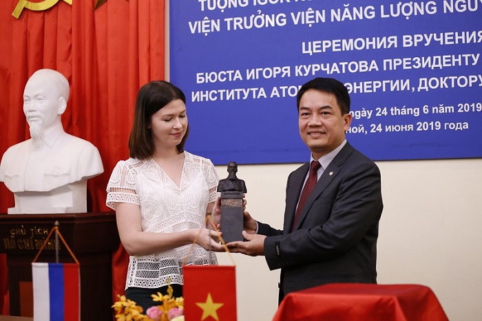 Bà Anna Zykova, đại diện của ROSATOM Đông Nam Á, trao tặng tượng của Viện sỹ Igor Kurchatov cho TS. Trần Chí Thành.