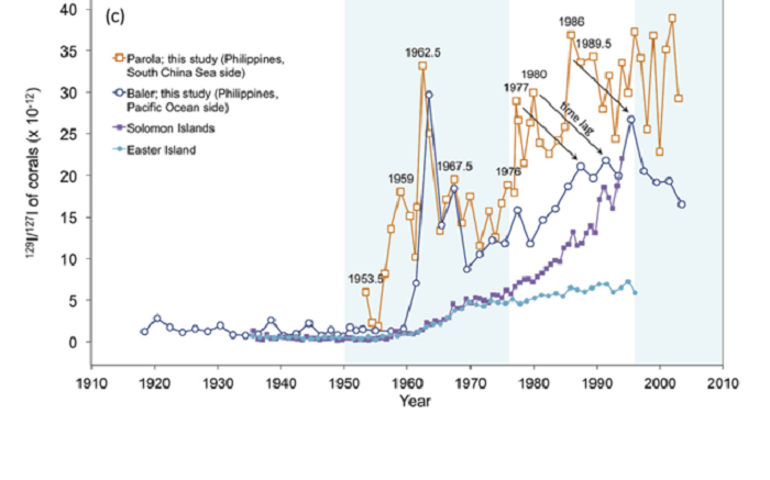Khi dùng kỹ thuật hạt nhân, phân tích các mẫu san hô lấy từ Baler và Parola trên máy khối phổ gia tốc AMS và quang phổ plasma ICP-MS đặt tại trường đại học Tokyo, Angel T.BautistaVII và cộng sự nhận thấy có sự tồn tại của iodine-129 – một trong những sản phẩm của phản ứng phân hạch hạt nhân như cesium-137 – trong mẫu san hô. “Tuy nhiên, chu kỳ bán rã của iodine-129 dài hơn nhiều so với cesium-137 bởi iodine-129 có thể tồn lưu trong môi trường 15,7 triệu năm trong khi chu kỳ bán rã của cesium-137 là vào khoảng 30 năm”, TS. Nguyễn Hào Quang, Viện Năng lượng nguyên tử Việt Nam (VINATOM), cho biết. Với chu kỳ bán rã này, có thể coi iodine-129 như đồng vị bền.