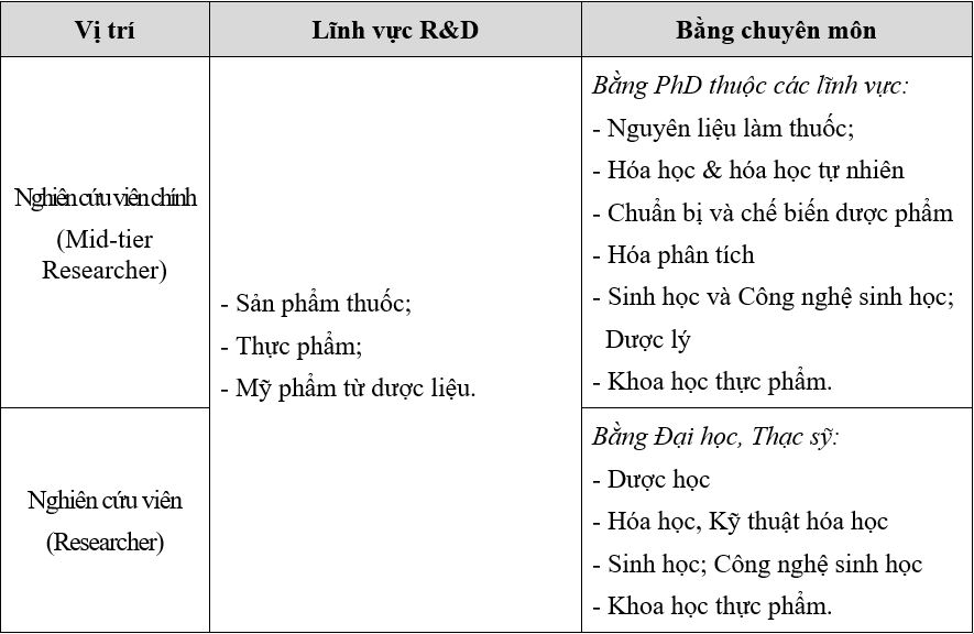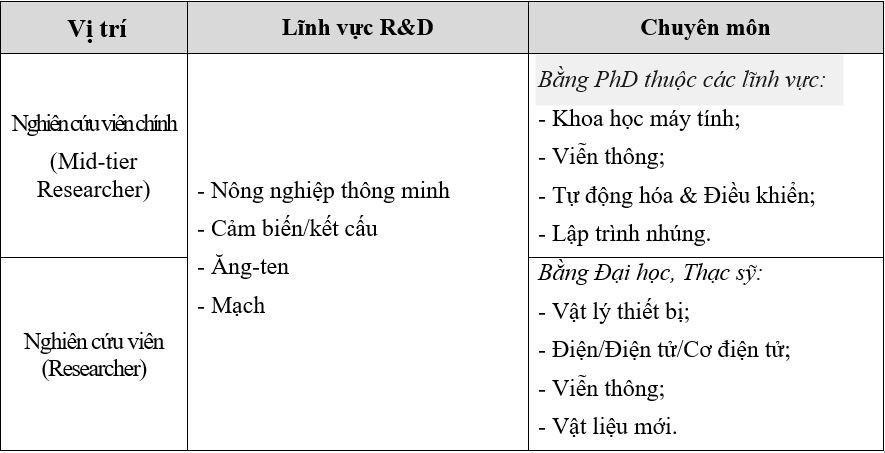– Nghiên cứu viên (Researcher): tốt nghiệp đại học hoặc thạc sĩ các chuyên ngành có liên quan (bao gồm cả ứng viên tốt nghiệp tháng 6 năm 2020).