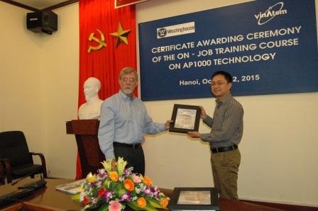 Sau khi hoàn thành chương trình học tập và làm việc tại Mỹ, TS Hoàng Sỹ Thân và TS Phạm Ngọc Đồng (Viện Năng lượng nguyên tử Việt Nam) đã được công ty Westinghouse (Mỹ) trao chứng chỉ về công nghệ nhà máy điện hạt nhân AP1000.