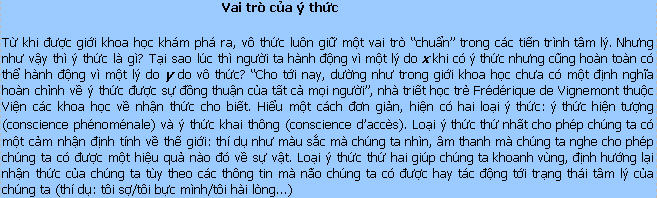 “Tôi suy nghĩ tức là tôi tồn tại”, Descartes đã từng nói như vậy. Không ai phủ nhận câu nói này của Descartes nhưng phải nói rằng phần lớn các hành động của chúng ta đều được thực hiện nhờ vô thức. Một cách khác chính xác hơn, theo Marc Jeannerod, Giám đốc Viện các khoa học về nhận thức, đó là các hành động “không có ý thức”. Để lấy một dẫn chứng, Marc cho biết: khi người ta đang lái ô tô và đột ngột phanh chiếc xe lại để tránh một chướng ngại vật, hành động này không phải là có ý thức. Đơn giản vì để có ý thức được một hành động, người ta cần một khoảng thời gian nhất định. “Như vậy thì chiếc xe đã đâm vào chướng ngại vật rồi”, Marc nói. Rõ ràng vô thức luôn có một vai trò cực kỳ quan trọng trong nhận thức mà chúng ta vẫn chưa còn biết tới. Theo các nhà nghiên cứu, vô thức dường như luôn đóng một vai trò thường trực trong tất cả các quá trình nhận thức và có thể có tới 90% hành động của chúng ta là… vô thức!