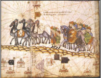 Một trong những bản đồ cần được chú ý là bản đồ hành trình, ghi lại các chuyến đi đến Châu Á, đặc biệt chuyến đi của Marco Polo. Tại Trung Á, trong vương quốc Tata của Sarai, một đoàn lạc đà (ảnh 7) chở hàng đi trước đám người đi bộ và các kỵ binh có vũ trang, trong đó có một người mệt quá ngủ thiếp đi trên lưng lạc đà. Đoàn người đi từ vương quốc Ssara vượt qua sa mạc Takla Makan để đến Catay (Trung Quốc).