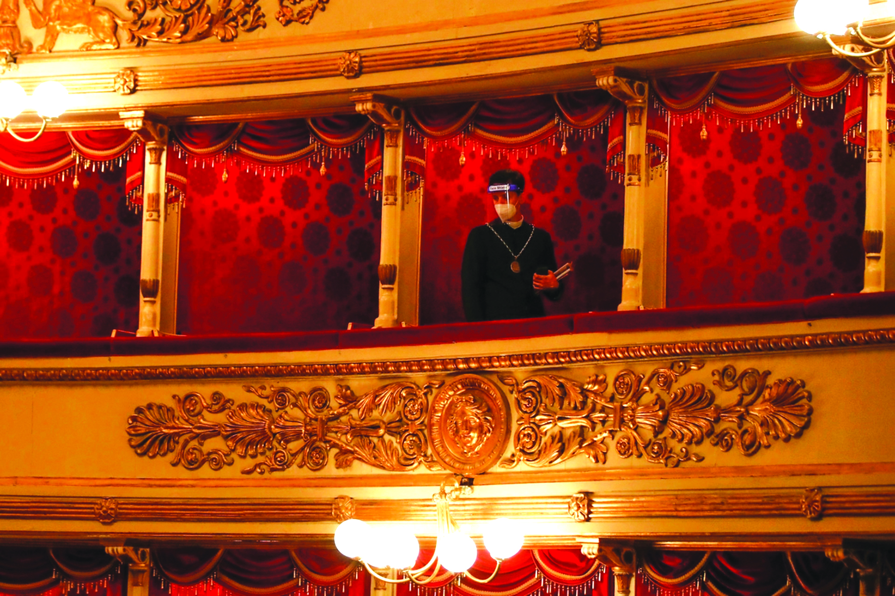 Một nhân viên của nhà hát La Scala theater ở Milan đeo mặt nạ và khẩu trang nhìn xuống khán phòng trống rỗng trong thời kỳ giãn cách xã hội ngày 6/7/2020. Ảnh: Antonio Calanni/AP Photo