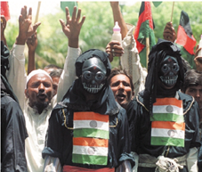 Những người phản đối mặc những bộ đồ thần Chết và mang cờ Ấn Độ tập trung trước đại sứ quán Pakistan ở New Delhi sau những vụ thử hạt nhân của Pakistan năm 1998. Một số người còn mang theo những chai sữa trẻ con để nhạo báng Pakistan là một đất nước trẻ con. Tuy nhiên, chúng ta cũng không rõ là liệu những người này có phản đối chính những vụ thử hạt nhân của Ấn Độ đã diễn ra vài tuần trước đó hay không. |