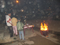 Tôi ghé xe nhìn kỹ. Ðó là những chiếc bàn con với bát hương, đèn cầy, giấy tiền giấy bạc, xôi chè, bánh cúng, hoa quả. Gương mặt của những chủ nhà đầy vẻ trầm mặc và cung kính. Có người đã bắt đầu hành lễ, sụp lạy hướng về phía đường và khấn vái đất trời