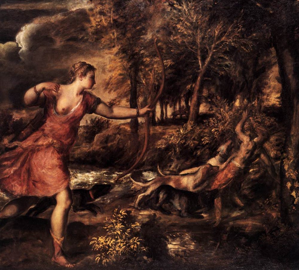 Titian cũng đã từng tái hiện khung cảnh này trong bức vẽ dành riêng cho Vua Philip II của Tây Ban Nha. Tuy nhiên, đến Cái chết của Actaeon, ông chỉ hé mở da thịt của nữ thần qua một núm vú lộ ra ngoài – hình ảnh ám chỉ tội lỗi của Actaeon. Thoạt tiên, khi vừa nhìn vào, có thể nhận thấy Diana chiếm vị trí nổi bật của bức tranh, nhưng đường cánh tay của nữ thần lại thu hút người xem đến những hình vẽ bên phải. Ở đây chúng ta nhận ra Actaeon đang bị mắc kẹt trong quá trình chuyển đổi. Chàng thợ săn vẫn giữ nguyên hình dạng cơ thể con người, nhưng đầu của chàng giờ đây lại là của một con hươu.