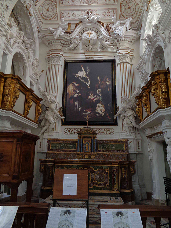 Một bản sao “Nativity with St Francis and St Lawrence” của Caravaggio tại Oratory of San Lorenzo in Palermo – một bản in phóng từ bức ảnh của Enzo Brai năm 1968