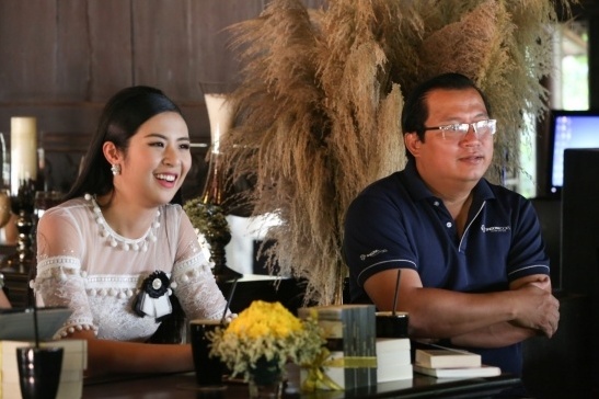 Tiến sĩ Nguyễn Tuấn Quỳnh (phải) và Hoa hậu Ngọc Hân tại cà phê sách về chủ đề “Thực học”.
