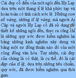 Chẳng hạn như cái đẹp trong quan niệm của người Ai Cập, hay người Hy Lạp cổ. Đó là cái đẹp của tỉ lệ (Sau này, người ta còn khám phá ra cái đẹp của nhịp điệu, mà người ta cho rằng còn quan trọng hơn).