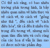 Trong phần lớn những trường phái hội họa tượng hình, từ xưa đến nay, và từ Đông sang Tây, cái đẹp được tái tạo bằng cách thể hiện cái đẹp cụ thể có trong thiên nhiên (tranh phong cảnh, tranh “tĩnh vật”, tranh súc vật, chân dung người…), hay trong đời sống thực tế hoặc trong những truyện thần thoại (tranh lịch sử, tranh tôn giáo). Xét cho cùng, đó là một luật chơi khá oái oăm: làm thế nào thể hiện được sự vật trong không gian ba chiều bằng những bức vẽ, bức họa, trên một mặt phẳng hai chiều? Vấn đề không phải là sao chép, mà là làm sao diễn đạt được cái thực tế ấy một cách thuyết phục nhất, nghệ thuật nhất.
