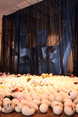![]() Thùy liêm thính chính (buông rèm chấp chính), cắt cảnh một pho tượng Tứ pháp và những quả trứng dưới nền trong Sắp đặt của Đào Châu Hải.