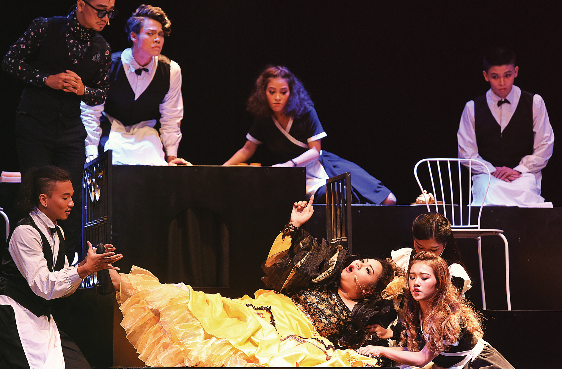 Phi Anh sử dụng những bản pop thời thượng của Lady Gaga, Britney Spears… cùng tác phẩm âm nhạc trong những vở ca vũ nhạc lẫy lừng như “Cabaret”, “Grease”, “Nine”… Mỗi vở có 17 nhạc công, đều là sinh viên nhạc viện. Một cách tình cờ, mỗi vở cũng sử dụng khoảng 17 ca khúc. Ảnh: Một cảnh trong vở “Góc phố danh vọng”, tháng 11/2016 – tác giả: Thanh Trần.