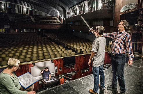 Zsolt Haja (trái) và Lajos Geiger đang vung gươm trong một buổi tập vở “Bank Ban” tại Nhà hát Erkel ở Budapest, một trong những tác phẩm Hungarian State Opera mang đến New York. Nguồn: Akos Stiller/The New York Times.
