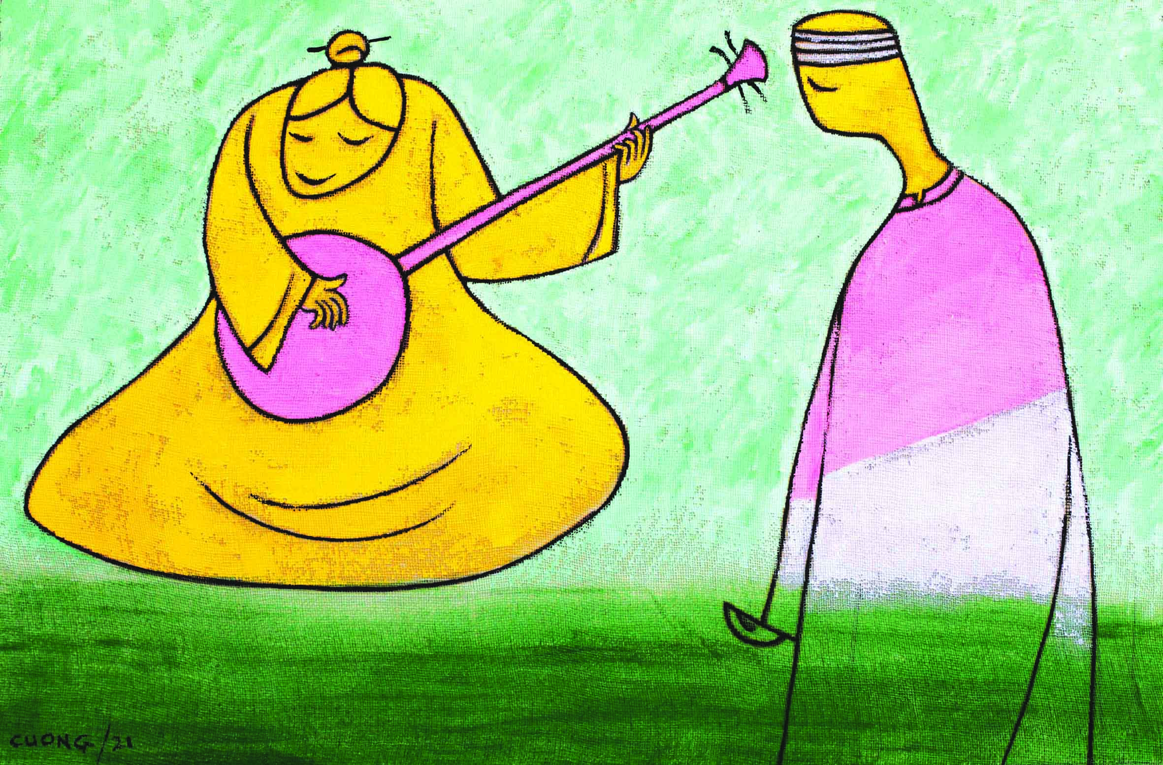 Cho nên ai vẽ Kiều chơi tỳ bà cũng hay. Nhưng tôi thích vẽ Kiều chơi đàn nguyệt. Tỳ bà và nguyệt đều là hai trong những nhạc cụ quen thuộc của người Việt. Ví dụ dàn nhạc ở chân tảng, chùa Phật Tích, Bắc Ninh, thế kỷ X. Các nhân vật vừa hát múa vừa sử dụng nhạc cụ: gõ sênh phách, đánh trống, kéo nhị, thổi sáo, gảy đàn tranh, đàn tỳ bà, đàn nguyệt. Riêng nhạc công đàn nguyệt bấm phím bằng bàn tay phải, gảy bằng tay trái, chắc do thuận tay trái? Hoặc các mảng chạm khắc gỗ trên cốn, ván nong ở chùa Thái Lạc, Hưng Yên, thế kỷ XIII cũng có cảnh tiên nữ chơi đàn tranh, tỳ bà và nguyệt. Đặc biệt là bức tranh sơn mài ở đình Lỗ Hạnh, Hiệp Hòa, Bắc Giang dựng năm 1576 vẽ cảnh tám cô tiên, mỗi người một nhạc cụ, đứng trên mây, trong đó có một cô chơi đàn nguyệt (cần dài, hai dây). Hoặc đồ án trang trí đường diềm tám món đồ quý của hoành phi câu đối sơn son thếp vàng, ngoài thanh kiếm, cây bút … thì có tỳ bà, có khi là sáo trúc. Đó là biểu tượng cho âm nhạc thôi, chứ không phải chỉ có tỳ bà và sáo trúc mới quý.