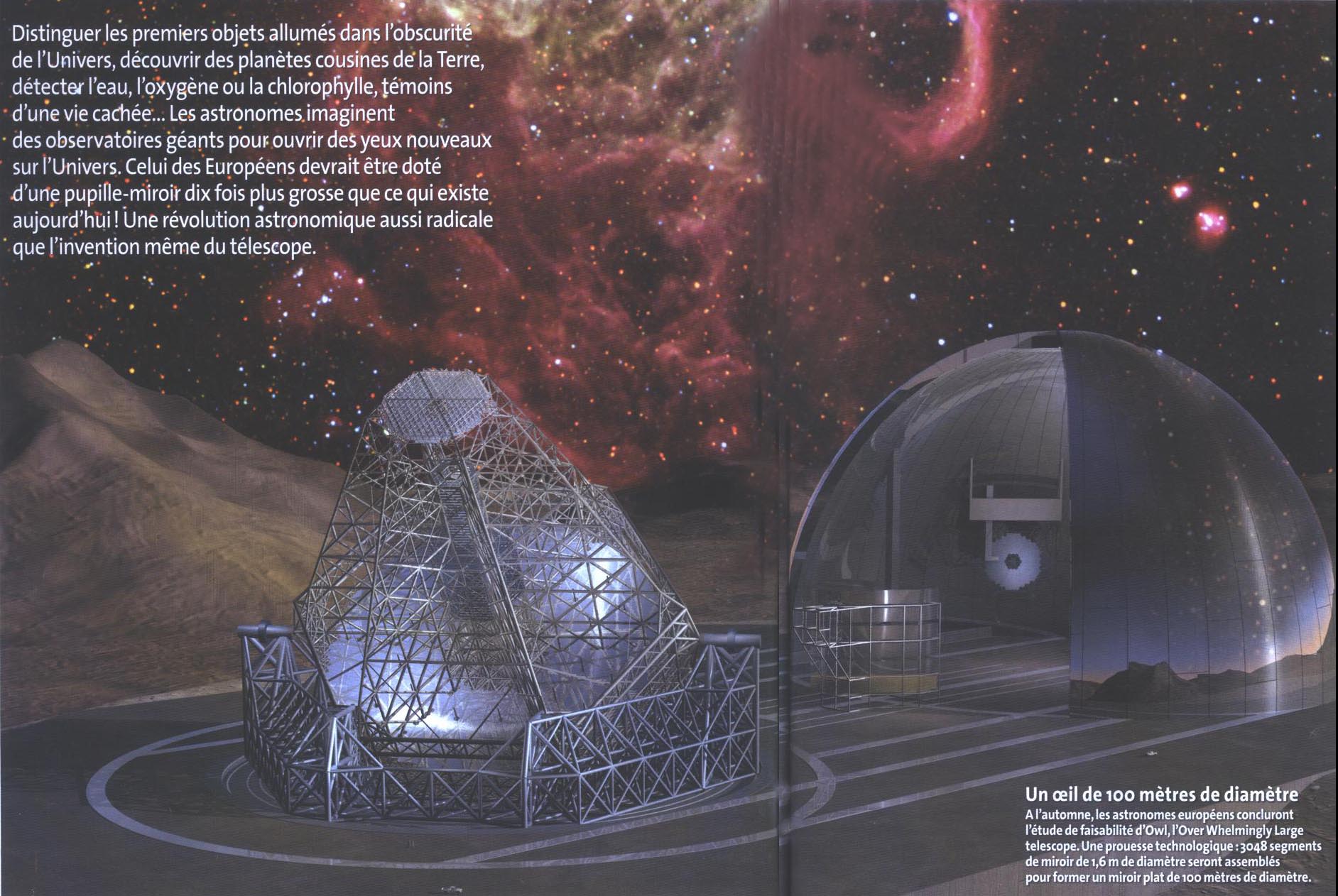 Vì vậy, Gilmozzi và các bạn của ông đã tính toán kích thước lý tưởng của một dụng cụ quan sát ngang tầm với các tham vọng thăm dò: đường kính 100m! Một giấc mơ ngày nay được cụ thể hóa và được đưa vào dự án Owl. Kính thiên văn Over Whelmingly Large, owl trong tiếng Anh gợi đến đôi mắt to của chim cú, sẽ “làm thay đổi căn bản ngành thiên văn như việc sáng chế ra kính thiên văn đã tạo ra cuộc cách mạng thiên văn cách đây 4 thế kỷ”. Trước khi kết thúc thập kỷ thứ hai của thế kỷ 21, kính thiên văn khổng lồ này sẽ thống trị sân khấu khoa học với một gương đường kính từ 60-100m. Nó sẽ được sự trợ giúp của hai dự án kính thiên văn của Mỹ quy mô nhỏ hơn, TMT (30m) và GMT (25m). Chỉ có con ngươi cực lớn của Owl mới có thể phát hiện được trong Thiên hà các hành tinh anh em của Trái đất và mới nhìn xuyên qua tấm màn khí quyển của chúng, để tìm nước, mêtan, ôxy, và cả diệp lục…, các yếu tố cần thiết cho mọi dạng sự sống ngoài Trái đất.